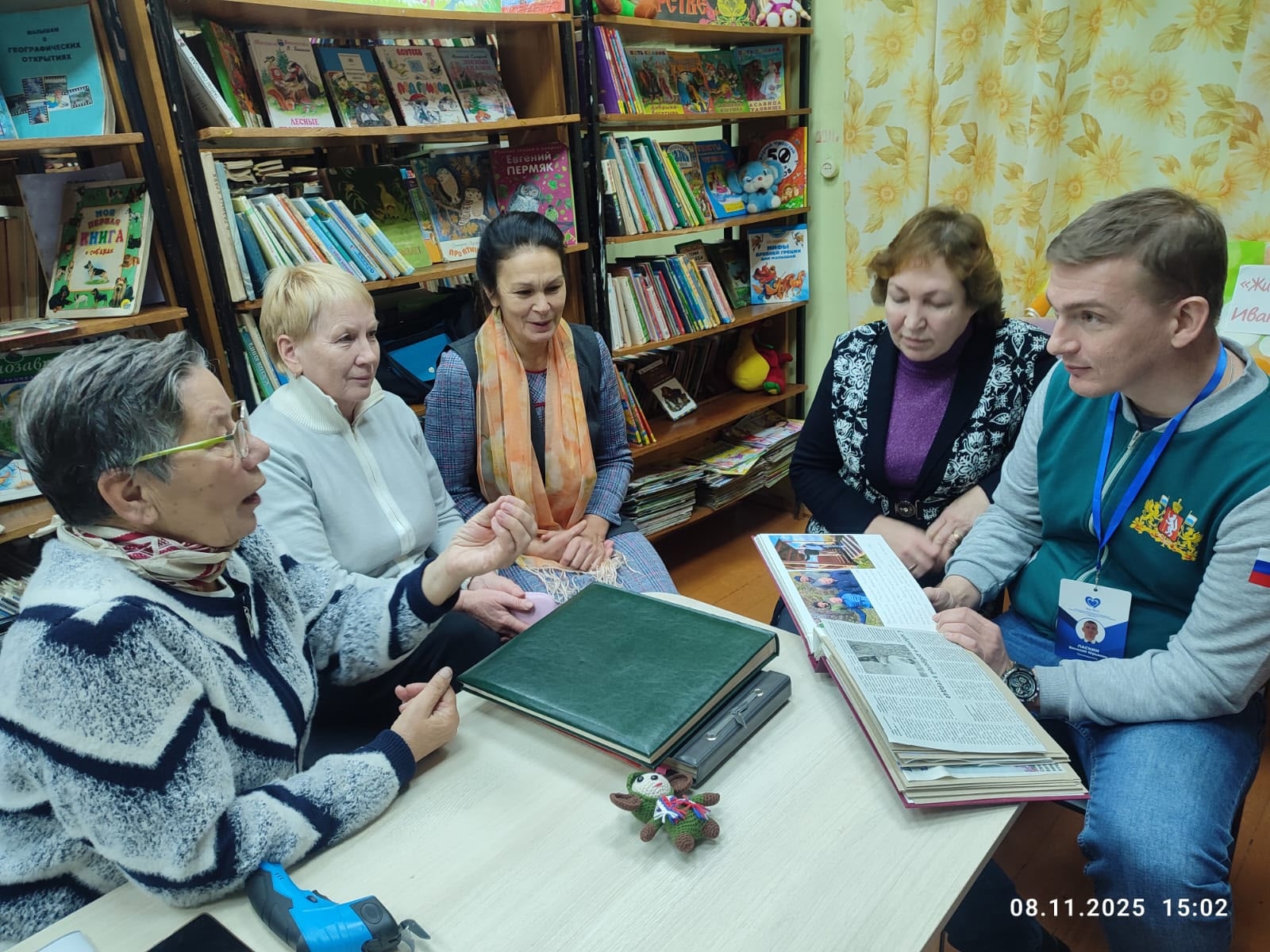 Встреча ветеранов села с организатором волонтерской группы "Люди дела" Ласкиным Василием Юрьевичем из г. Екатеринбурга, который поделился опытом работы по оказанию помощи пожилым людям, попавшим в трудную жизненную ситуацию. Очень заинтересовался работой по сбору гуманитарной помощи на СВО, в том числе изготовлением масксетей нашими ветеранами.